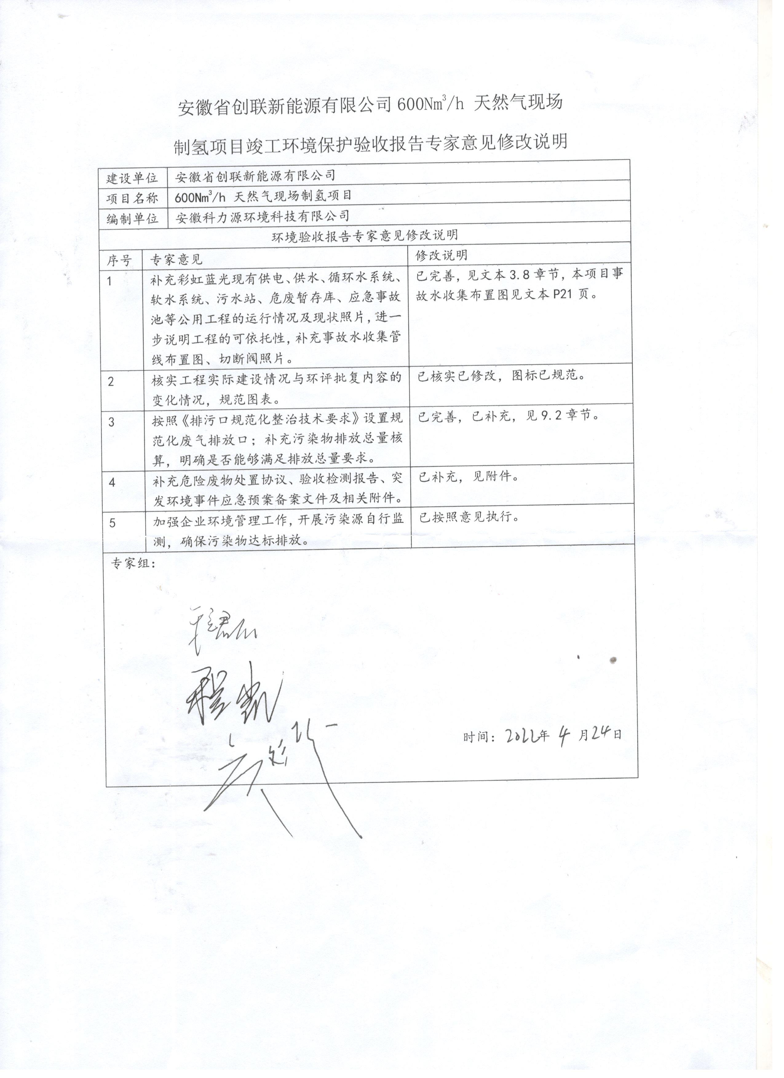 安徽省創(chuàng)聯(lián)新能源有限公司600Nm3/h 天然氣現(xiàn)場制氫項目驗收組嚴(yán)格依照國家有關(guān)法律法規(guī)、建設(shè)項目竣工環(huán)境保護驗收技術(shù)規(guī)范、本項目環(huán)評報告書和審批部門審批決定等要求對本項目進行驗收。驗收組認(rèn)為本項目實施工程按照環(huán)評及其批復(fù)的要求,落實了相關(guān)環(huán)保設(shè)施,建立了相應(yīng)環(huán)保管理制度,符合環(huán)保驗收條件,可通過環(huán)保驗收。根據(jù)《國務(wù)院關(guān)于修改<建設(shè)項目環(huán)境保護管理條例>的決定》(國務(wù)院令第682號),以及環(huán)境保護部《關(guān)于發(fā)布<建設(shè)項目竣工環(huán)境保護驗收暫行辦法>的公告(國環(huán)規(guī)環(huán)評[2017]4號),現(xiàn)安徽省創(chuàng)聯(lián)新能源有限公司600Nm3/h 天然氣現(xiàn)場制氫項目竣工環(huán)境保護驗收報告公示如下: